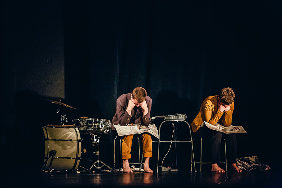 La musique, créée sur le vif, est construite, déconstruite, superposée, elle est comme une image en mémoire, une envahissante ritournelle ; viennent s’ajouter les sons amplifiés des corps en mouvement, des souffles et des journaux.
