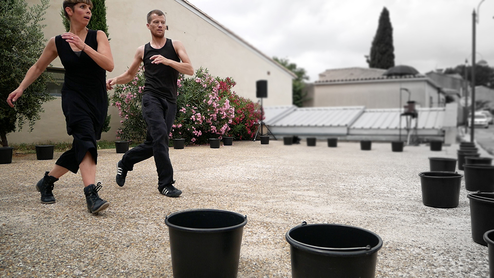 36 seaux noirs comme des flaques, une symphonie de gouttes invisibles et deux danseurs qui laissent entrevoir l’eau.